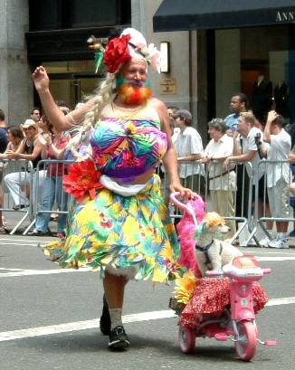 かなりのおじいさんのように見えた、ドラッグクイーンのかた。連れのプードルも、おそろいのレインボーカラーに毛を染めていた。