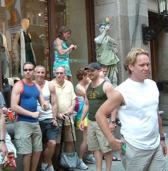 観客の皆さんも、かなりのマッチョぞろい。台の上には、自由の女神と女装のお兄さんが居る。見物人がみんなデカいし幅取るので、パレードを見るのにひと苦労だった。