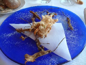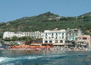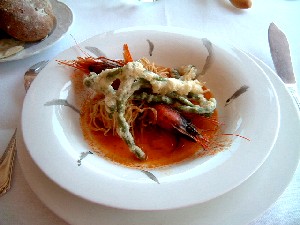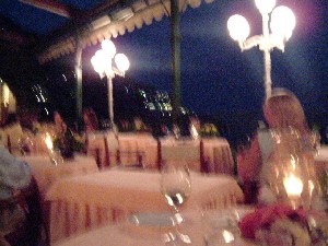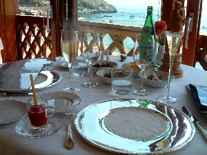 レストランは入り口に立派な本が飾ってあって、左のページが開いてある。その写真の人が慇懃に出迎えてくれたので、思わず「オーナーですか?」と聞いたら、「違う」と笑っていた。 このおじさんは、全部のテーブルをさりげなく回ってメニューの説明をしていたけど、私たちのテーブルでは日本語に直して読み上げてくれた。ちょっとお経みたいだったけど楽しかった。 地図で見れば近かったけど、ポジターノからこのレストランまではタクシーで45分くらいかかった。崖っぷちの山道をくねくねと行くのは景色がきれいで楽しいけれど、車酔いするんじゃないかとヒヤヒヤした。行きに酔ったらせっかくのごちそうが食べられなくなるし、帰りに酔ったらもったいない。又、往復のタクシー代と、食事の間運転手さんを待たせておいたチップは、食事代と同じくらいかかってしまった。じゃあレンタカーで行けばよかったかと言えば、観光客が夜あの道を運転するのは相当大変だと思う。レストランでワインを楽しめないのもイヤだしね。 タベルナ・デル・カピターノ★:マリーナディカントーネ 半島の先の方にあるこのレストランには、なんと!ボートをチャーターして行った。それでもドン・アルフォンソに行った時のタクシー代よりは、ちょっとは安くついた。時間も20分くらいと短かったしね。