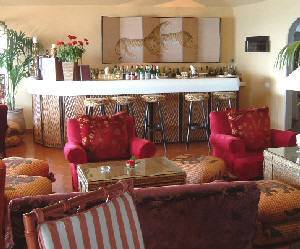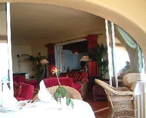 テラス側から見たダイニング。インテリアはなぜかオリエンタルムード こじんまりしているけど豪華なロビーの先は、海を一面に見渡すテラスになっていて、テーブルが配置してある。日焼けがちょっと気になったけど、思い切って海を見渡す席に座らせてもらう。他にお客さんは二組。すんごい気取った英語を話す人と、フランス語を話す人たちだった。