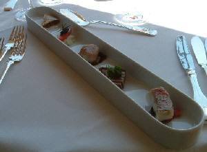アミューズ:懐石みたいな盛り合わせ(左)と子牛ののど肉とルッコラサラダ(右) ランチメニューはディナーのメニューと違うと聞いて、ちょっとがっかりだったけど、アミューズが2種類も出てくるし、どのお皿も本当に美味しかった。かっと照りつける太陽にきらめく海を見ながらゆっくりゆっくり、全部残さず平らげてしまった。