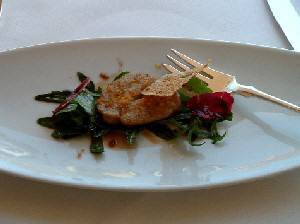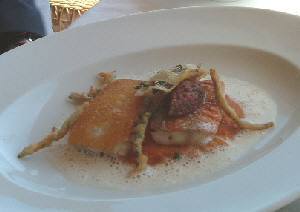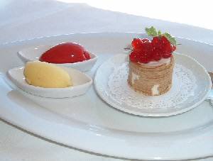 ![]() カレイのキャビアソース(上左)とボラのトマトオニオンピューレ(上右) メインディッシュは白身が重なってしまったけど、カレイとボラ。カレイには、カリカリの揚げ玉や甘いドライトマトが添えてあり、ボラは半分はフライで半分は野菜ソース乗せになっている。 どちらもソースや添え物との組み合わせで、色々な歯ごたえや味を楽しめるように工夫されている。アミューズの器や盛り付けや組み合わせの妙を楽しませようとするレシピの構成は、何だか和食の繊細さが意識されているようで、妙に嬉しくなった。 ![]() お口直しのスイーツ。デザートメニューは別にあるんだけど、もうこれで充分 帰りはホテルのパンフレットももらって、宿泊の予約は6ヶ月前までにしてくださいね、と言われて、はい、なんてニコニコ。2週末を含む最低1週間の予約が必要で、料金は朝晩の食事付きで360ユーロから、バルコニー付きのお部屋は400ユーロからだそうだ。宿泊料金の高さより、あのメニューを毎晩食べなきゃいけないと思うとあまりに太りそうで、怖くて泊まれない。でも、どんなメニューが出てくるのか、期待にワクワクしながら毎晩シェフと勝負するのも、うんとゼイタクな休暇の過ごし方として最高に楽しいのかもしれない。 ![]() ホテルの全景はこんな感じらしい |