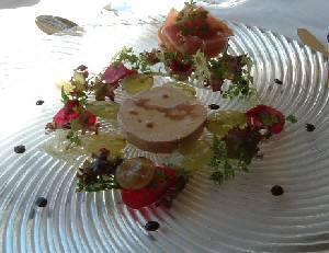 ![]() 泡立ったフワフワのソースに感動したサーモンとキュウリのスパゲティ(上左) ダックリバーとフォアグラのパテ(上右)