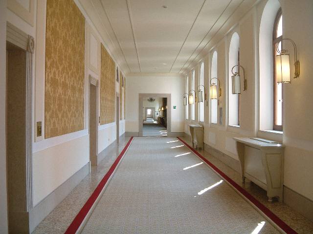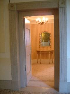 やっととれた新装開店のホテルは元病院だった今回の旅行は日が迫ってから予約を始めたので、ミシュランの赤印字ホテルには軒並み満室だと断られた。唯一取れたのがこのサンクレメンテホテルだった。 ホテルはベネチア本島からちょっと離れた小島にある。島全体がホテルになっていて、正面にドーンと大きな階段があって、天井の高いところはまるでホテルリッツみたい。(リッツはバルセロナのしか知らないんだけどね) シャイニングと違って、何も出なかったずいぶん立派な趣なので、このホテルはいつできたのか?と聞いたら若干2年半前だとのこと。ホテルはこの島にあった200年前にできた病院を改装して作ったんだそうだ。 そう言われてみれば長ーい廊下やひんやりした石の床など、いかにも病院風。人影をあまり見ないので、シャイニングに出てくる巨大ホテルに雰囲気が似ているとも言える。こんなゼイタクな病院に入っていた狂人たちは、いったいどんな人たちだったんだろうと、想像たくましくなってしまう雰囲気だ。しかも部屋はXX49号室で日本人にはちと縁起が悪い数字。どうぞ何も出ませんように…。