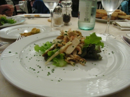 タクシーでジェノバのほうに少し戻ったヴァリゴッティという街にあるひとつ星「ムラグリア★」でランチ。このレストラン、日本から電話したら英語がぜんぜん通じず、破れかぶれでイタリア語で予約を試みたがうまくいかず断念。イタリアに来てからホテルのコンシェルジュに頼んでやっと予約が取れた。お店に行ったら満員で予約のない客はどんどん断られていた。危ないところだった。