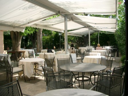 市街地から少し離れた住宅街の中のお屋敷。広い庭の一画にシェードが置かれ、その下にテーブルが10個ほど並べられている。陽の匂いと庭木の匂いがする。食前酒はSがシャンパーニュ、僕がヴァン・キュイ(Vin Cuit)というリキュールを飲みながら、ゆっくりとメニューを調べる。