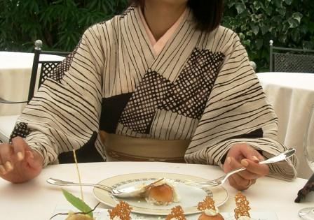 今日は白地に茶の幾何学模様の綿麻混のキモノにミンサーの半幅帯だ。行くレストランはミシュランの星二つで、今までの中で一番格が高いけれど、暑いのでこれでご容赦いただくことにした。レストランはガーデンにあって風が無い日だったし、昼間に石畳の町を歩いてけっこう汗をかいてしまったので、このキモノでもやっぱり暑かった。