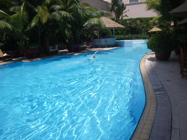 私が一番気に入ったのは、たっぷりと大きなプールだった。建物の谷間にあるので、午後は日陰になる。蒸し暑い日中、大きな日傘ですっぽりと覆われているようなプールサイドで、ゆっくりと過ごせる。プールの隣にあるきれいで贅沢な作りのスパはいつも空いていて、ジェットバスを独占できる。アメニティも充実していたので、置いてある化粧品を使ってメイクアップもばっちりできたよ。