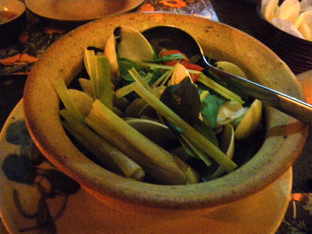 ここで頼んだのは、「揚春巻」「蛤の蒸し物」「牛肉のグリルと生麺(ブン)と香草をライスペーパーで包んで食べるもの」「花ニラともやしの炒め」。昼のSong Nguの料理は中華っぽかったけれども、こちらは私たち日本人が思っているイメージ通りのベトナム料理という感じだった。