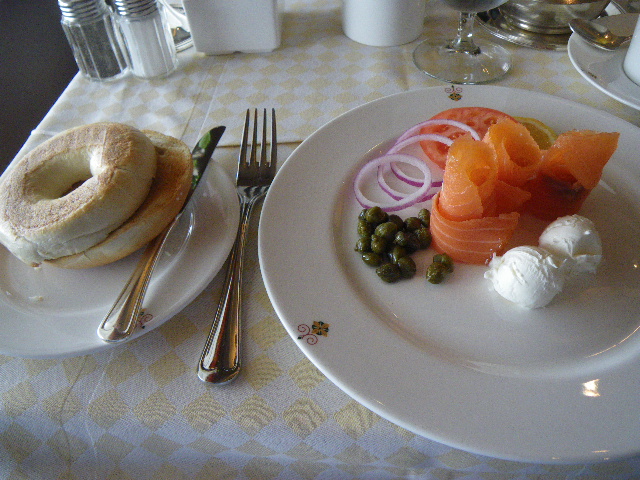 Sabatiniでは、まずはミモザをいただいて、Gはベーグルにスモークサーモン、クリームチーズ、ケッパー、トマトを乗せたもの。私はポーチドエッグに特別に野菜のソテーを添えてもらって、トーストを食べる。