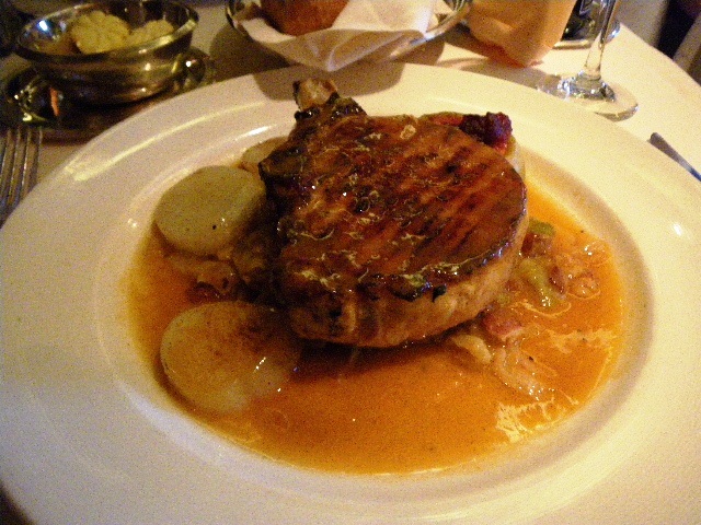この船のポークチョップは美味しいよと他のお客さんに推薦されたので頼んだんだけどね。隣のアメリカ人夫婦はぺろりと平らげていたし、なかなか切れなかった私とは経験の違いですかね。