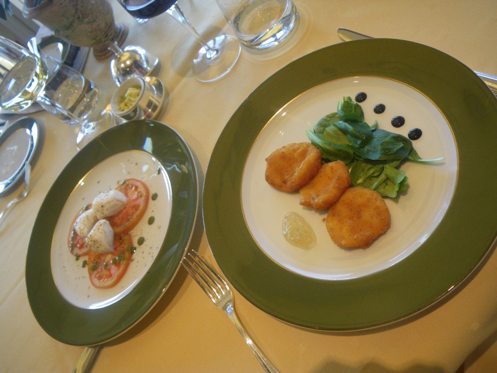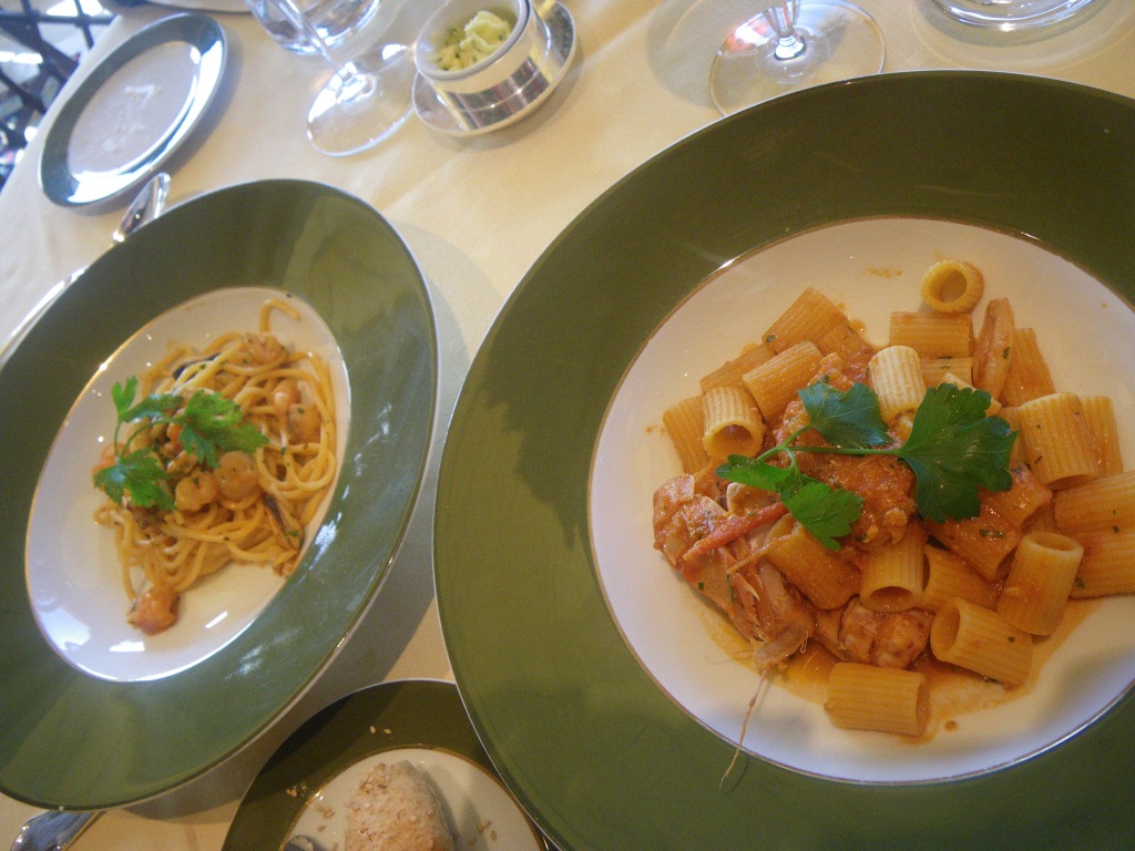 L'Olivoのチーズのフリット、カプレーゼ、ウチワエビのmezzemaniche、シーフードスパゲティ