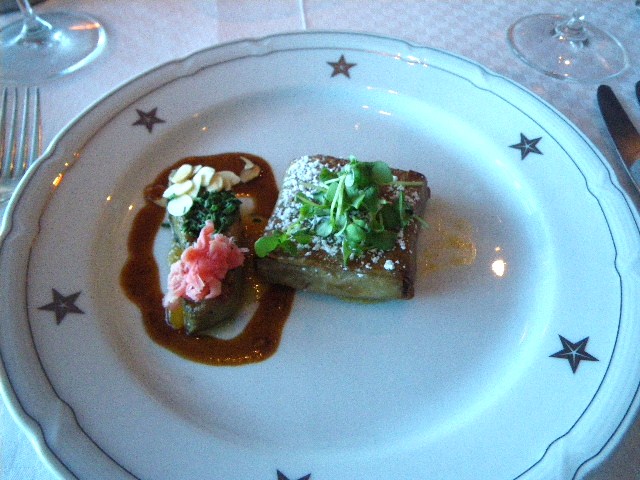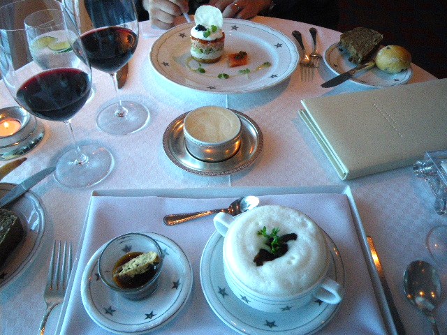 フォアグラのソテー、ポルチーニのスープ、トマトとモッツァレラのサラダ
