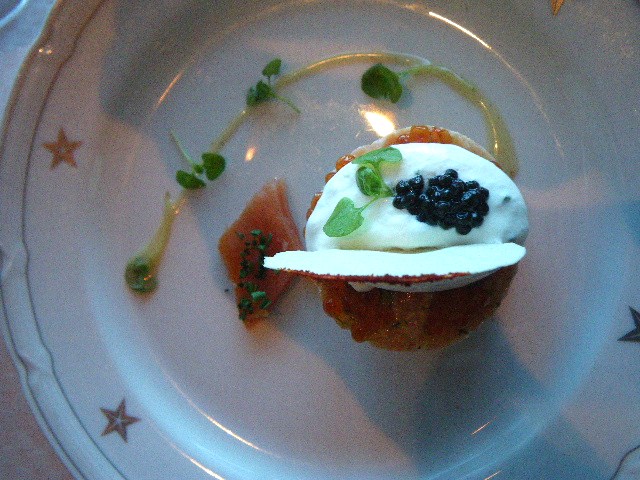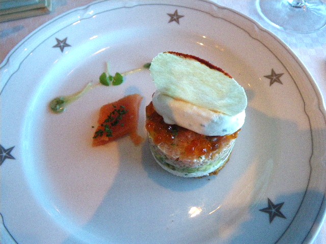 パパイアスープ、アボガド サーモン クラブケーキのイクラ・キャビア添え、ホタテのパイ包み