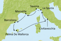 1. Savona 2. Marseille 3. Barcelona 4. Palma De Mallorca 5. At Sea 6. Civitavecchia 7. La Spezia 8. Savona |