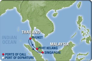 1. シンガポール 2. クアラルンプール 3. プーケット 4. プーケット 5. 終日航海 6. シンガポール |