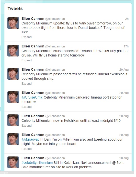 同じ時期アラスカでセレブリティ・ミレニアムで起こったエンジン故障でのキャンセルも、だいたい同じような対応だ。でも会社が飛行機で連れて行ってくれるのはバンクーバーまでで、そこから先は自分で手配しなくてはならなかったようだ。