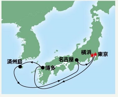 東京を4/25に出て、4/27福岡ののち、済州島に寄って、4/30名古屋、5/1横浜で下船です。