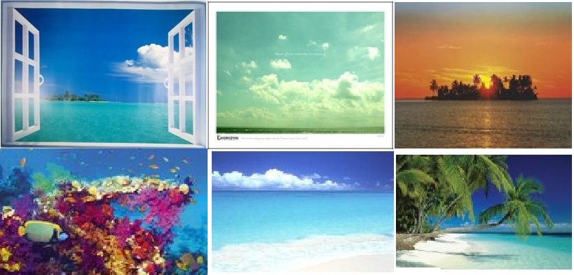 お風呂や部屋の壁に貼れるポスターが、ヤシの木、サンゴ礁、入道雲、夕暮れ、イルカ、海辺にたたずむ美女たち…といろいろ選べます。