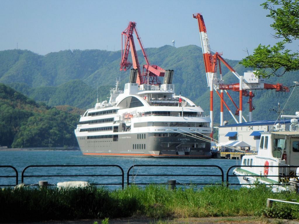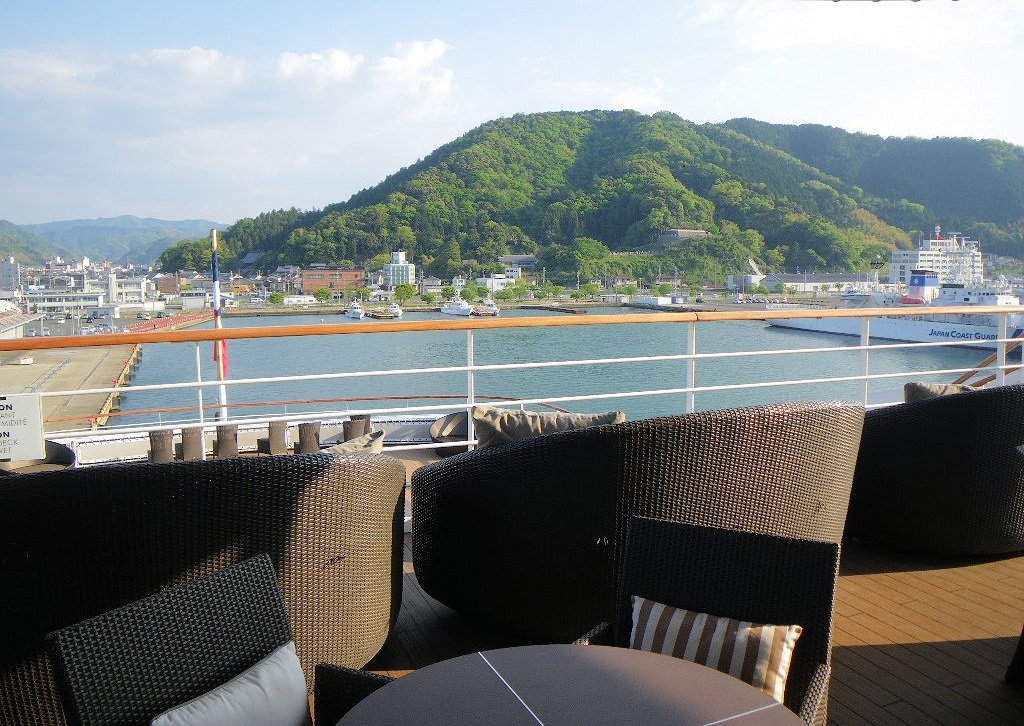 写真は埠頭への入り口から撮った舞鶴西港第2埠頭のポナン・ロストラル。海に迫る新緑の山々と入り組んだ湾とそこに浮かぶ船。こういうところに来られるのも、日本周遊クルーズならではだなあ。