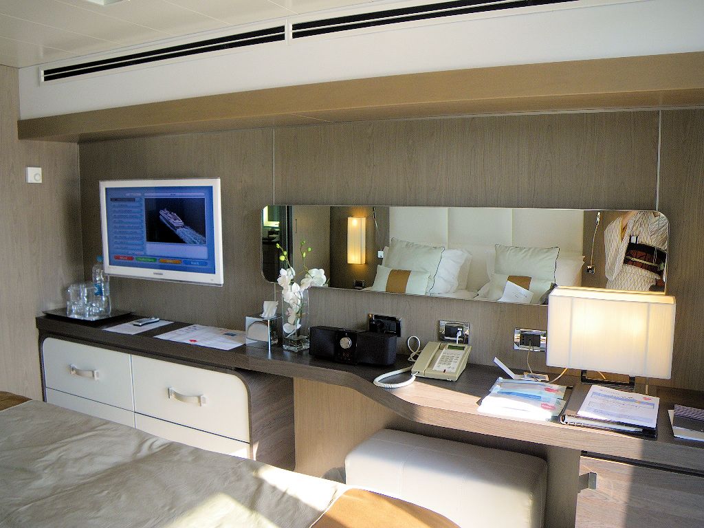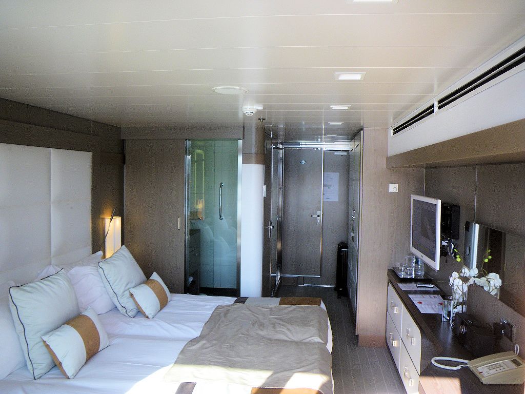 部屋の中はクルーズ・クリティックで読んでいた通りの「白基調ですてきだけれど、収納が効率よくできない」「シャワーとトイレが別々で、洗面台が小さい」「ベッドルームからシャワールームがシースルー(=丸見え)になっている変な作り」だった。