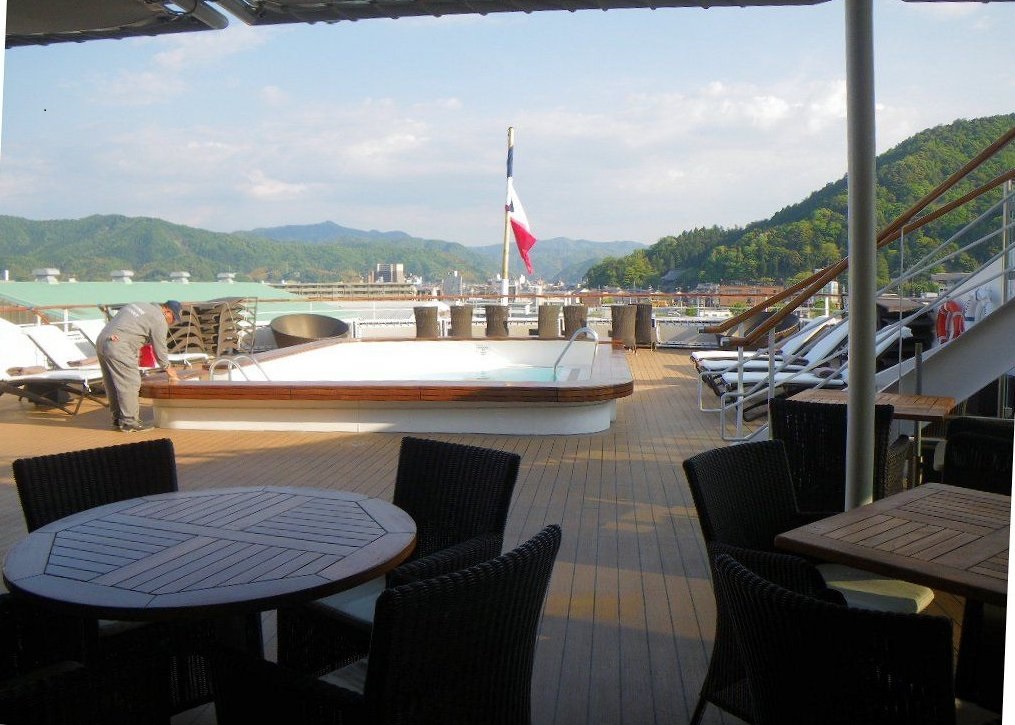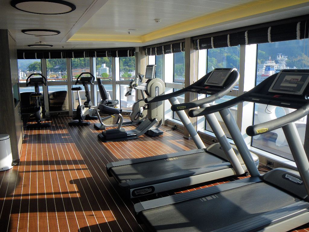 最上階の船尾のビュッフェと、その上のバーのテラスがお気に入りの場所になった。見晴らしのいい場所は他にもたくさんあったけれど、ジムは小さかったな。スチームサウナがあって空いているのはいいけれども、着替えるスペースもない。横のトイレに入ってこそこそTシャツを脱いだりして、これも小型船ならではってことかな。