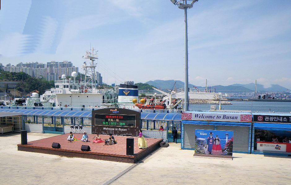 上の写真は部屋から見えた釜山の埠頭。目の前にステージとインフォのブースがあって、カンカン照りの暑い中、入れ代わり立ち代わりバンドが演奏してくれた。小さな船からは距離も近くてよく見えたけれど、この日の寄港はポナン・ロストラルの250人程度だったので、拍手が小さくてお気の毒でした。