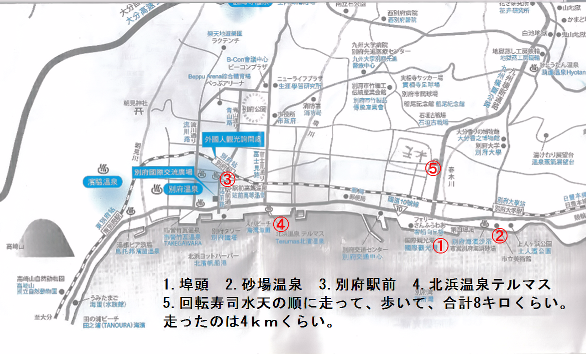 別府では昨日の対馬での雨がウソのようによく晴れていた。5月のはじめなのに予想最高気温はナント26度だ。温泉巡りツアーに出かける人たちに混ざって、水着の上にTシャツと短パンを着た私たちも別府の港に降り立つ。走ってどこかの温泉プールまで行き、汗を流して食事をして船に戻ってくるのだ。そのためにGが二人分の着替えと私の洗面道具をリュックに入れて背負っている。