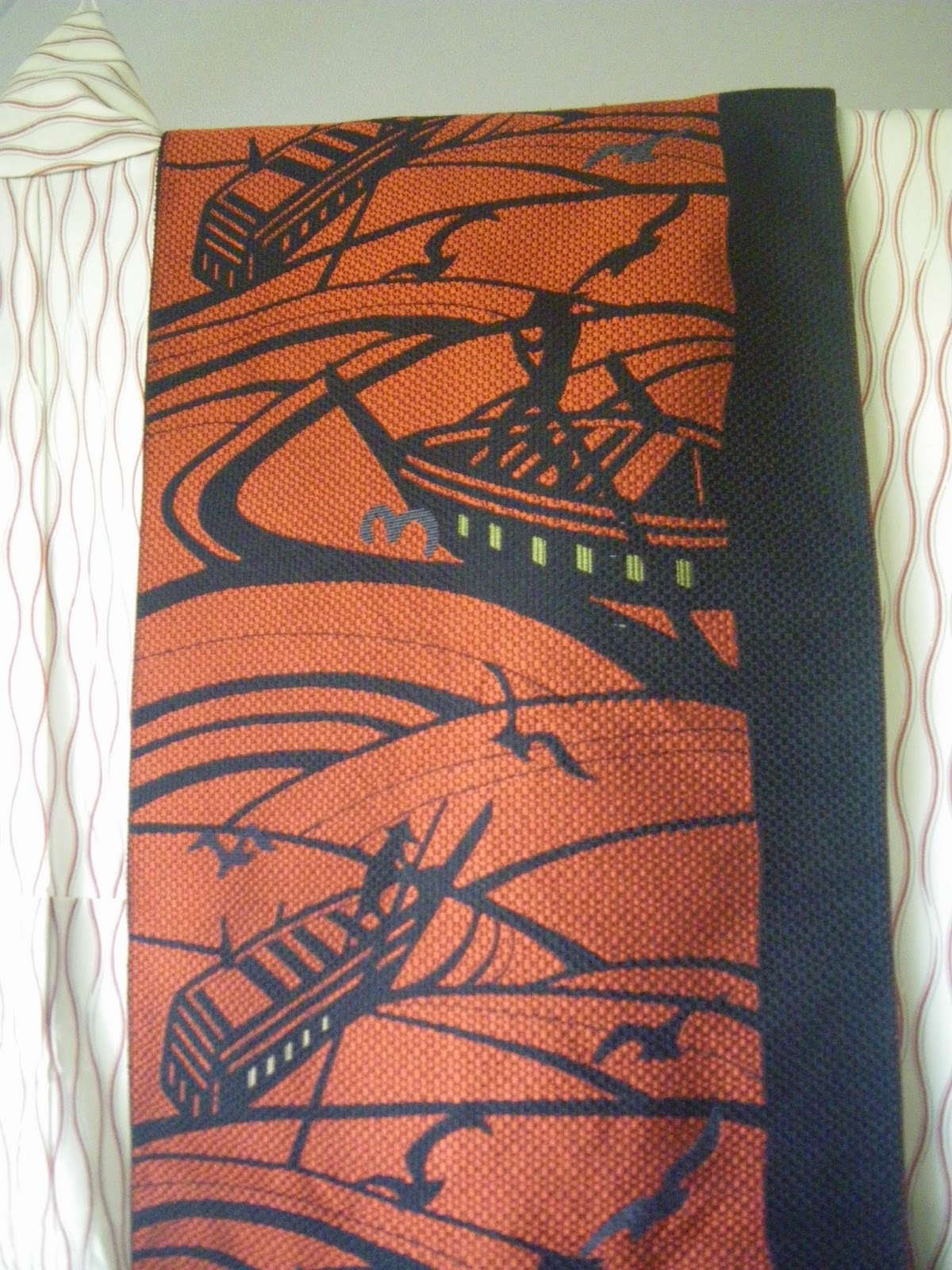 写真は最初のパーティーで〆た、山と波の抽象模様の染め帯。風景に合っているでしょう? でもこの帯よりよっぽどウケたのは、袖丈の合わない羽織を着るのに、着物の袖を端折って着物クリップで留めてたことかな。
