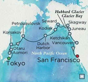 東京を発って青森と小樽に寄港し、ロシアのコルサコフとペテロパブロフスクを通ってアラスカのダッチハーバーに寄港。その後サンフランシスコまで南下する、探検船のようなコースです。
