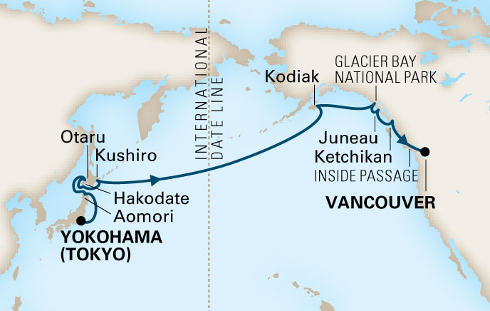 横浜に一泊した後、青森、小樽、函館、釧路に寄港し、終日航海が5日間。その後アラスカのコディアックから順に南下して、5/4にバンクーバーで下船です。