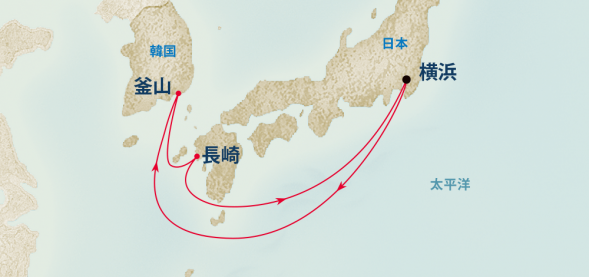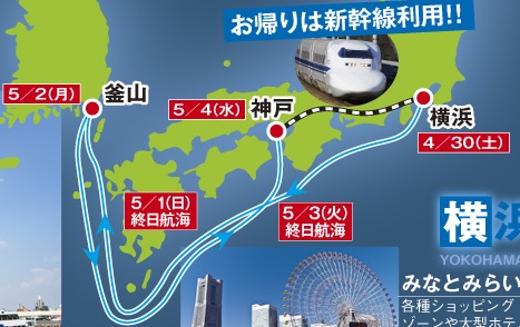 このクルーズでは、4/30に横浜を発って終日航海ののち、釜山に寄港。また1日終日航海をして、5/3に神戸で下船です。ちょっとあわただしいですがこの日程ならゴールデンウィーク中に収まります。