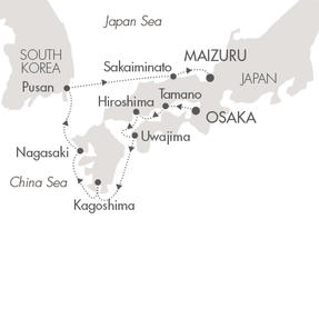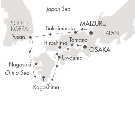 この大阪発のクルーズはその第1回目で、瀬戸内海を通りながら玉野、広島、宇和島に寄港した後、鹿児島、長崎、釜山、境港に寄って舞鶴で下船です。